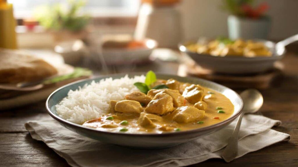A mild, creamy curry slides easily into family routines. Kids usually accept it without negotiations, adults can add extra chili flakes at the table, and it reheats beautifully for the next day’s lunch. It’s forgiving: a bit more cream, a bit less spice, frozen peas tossed in at the last minute, it all blends into the sauce.