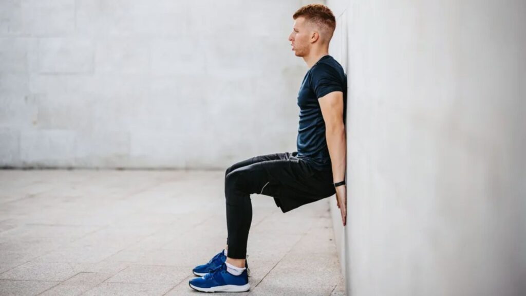 The wall-ball prisoner squat activates your entire body, targeting your legs, glutes, and core. Placing your hands behind your head forces your upper body to work harder to stay upright, opening your chest and engaging your shoulder muscles. For those with limited mobility, this version is more challenging than a standard squat.