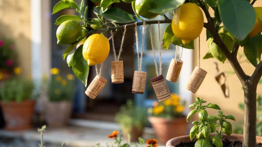 Hanging natural corks on lemon branches can make the tree less inviting to pests while keeping the whole system almost completely chemical‑free.